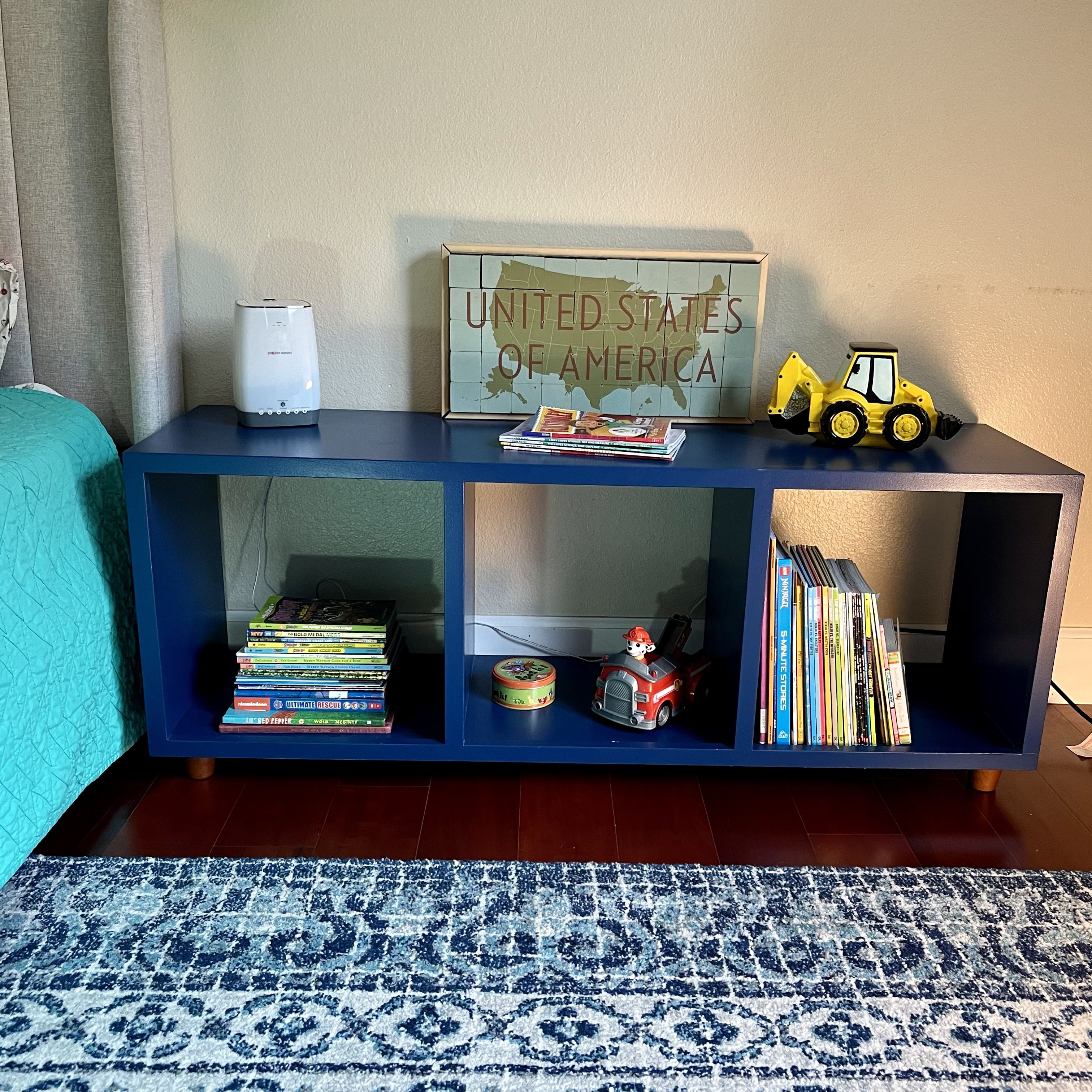 A simple bookshelf for a child’s room that can double as a seat or bed side stand. Accenting wood feet elevate this piece to give an air of sophistication.