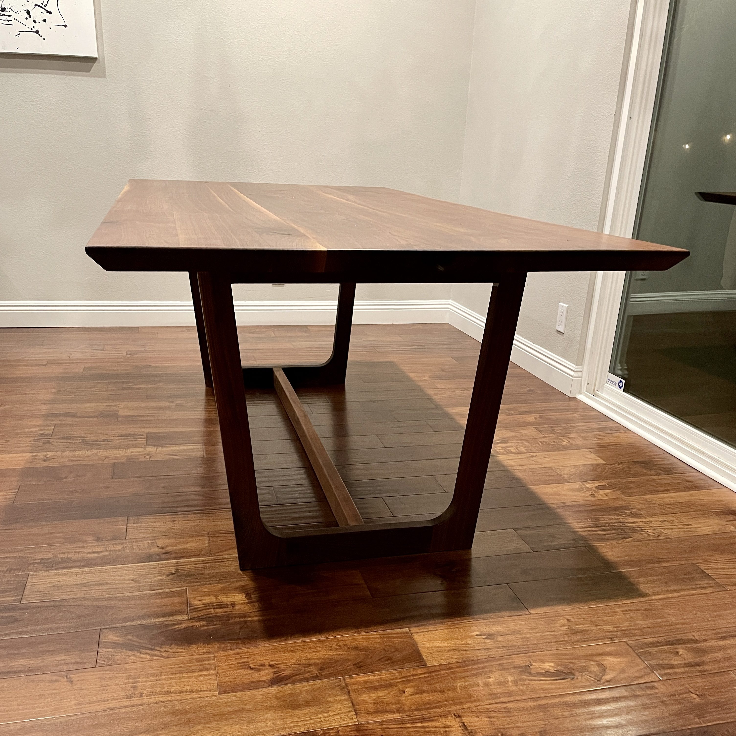 A solid walnut dining table designed to seat 8. The piece is refined to highlight the natural features of the top through a balance of bevels and softened edges with subtle curves in the leg assembly.