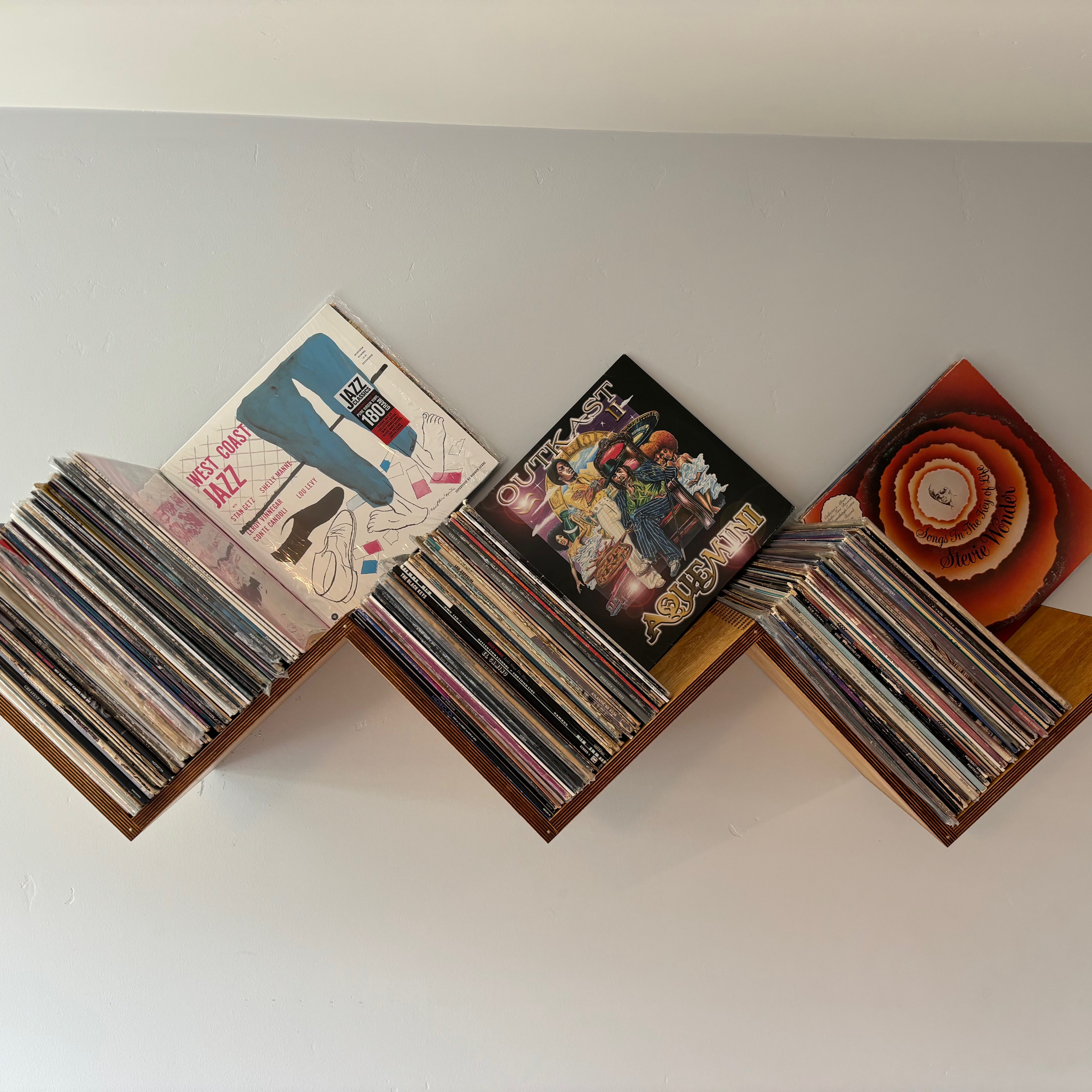 A unique design to display and store records. Made of baltic birch plywood the panels come together with box joints and are pinned with brass inserts. To support the records and allow for mounting, the back of the shelf has aluminum panels that are painted white enamel to help them disappear into the wall when the section isn’t full. It is finished in a custom color to capture the midcentury palette yet be subtle amongst the collection.